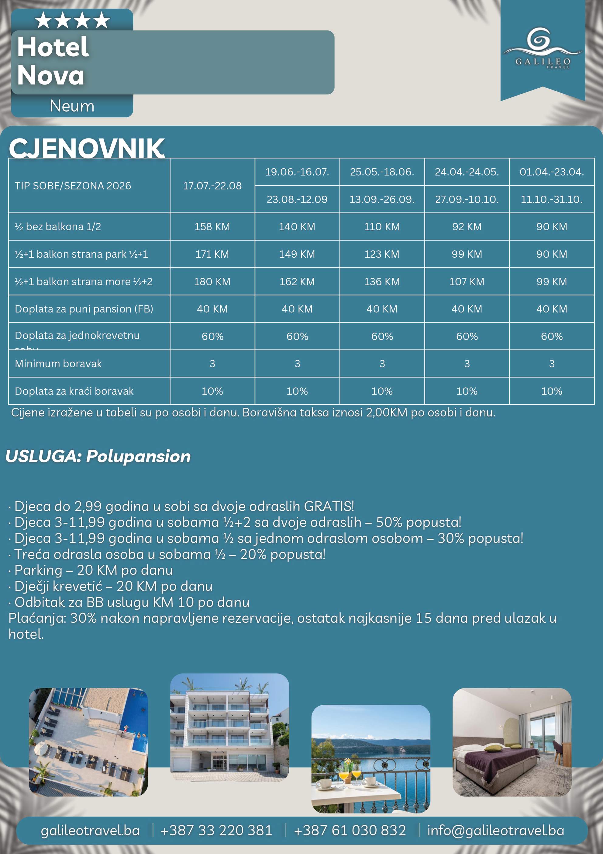 90 Cijena od BAMKM90/osoba Broj putnika: 90 Ukupno KM 90 BAM Provjera dostupnosti O putovanju Destinacija: Bosna i Hercegovina Smještaj: Dvokrevetne i trokrevetne sobe Polupansion: Uključen u cijenu Tip putovanja