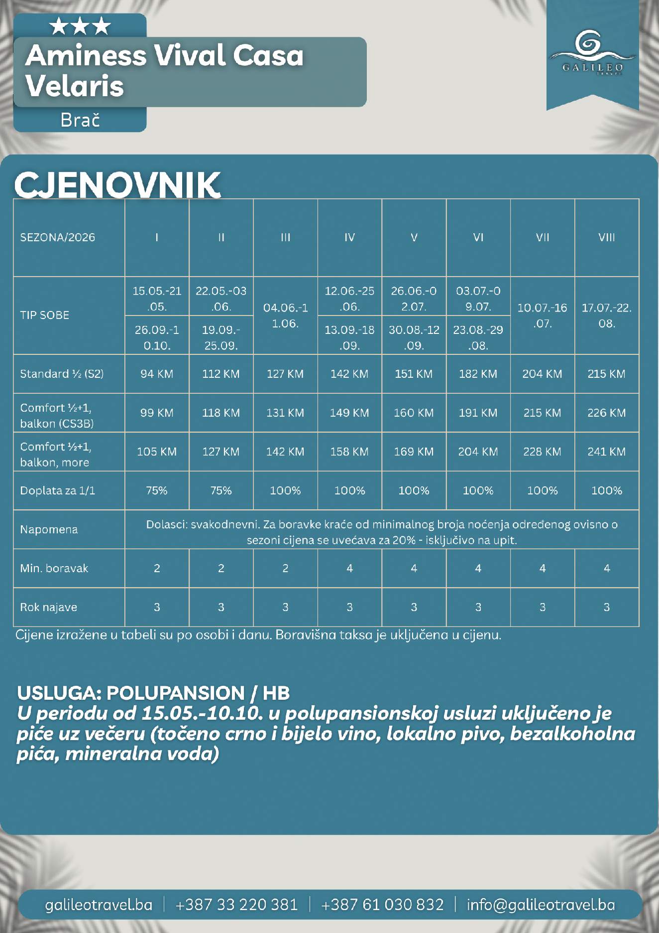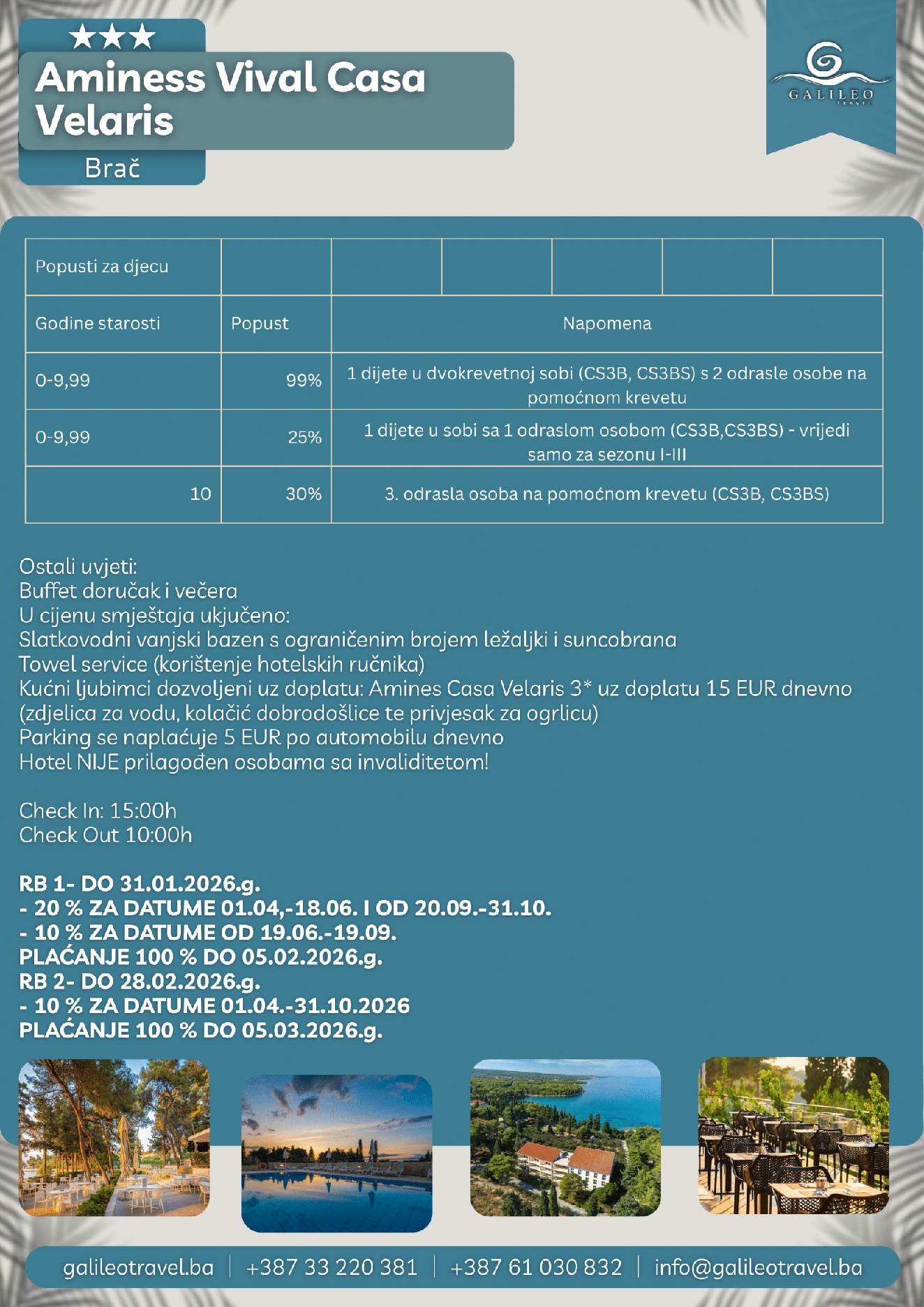 Aminess Vival Casa Velaris Aminess Vival Casa Velaris 94 Cijena od BAMKM94/osoba Broj putnika: 94 Ukupno KM 94 BAM Provjera dostupnosti O putovanju Destinacija: Hrvatska Smještaj: Dvokrevetne i trokrevetne sobe Polupansion: Uključen u cijenu Tip putovanja