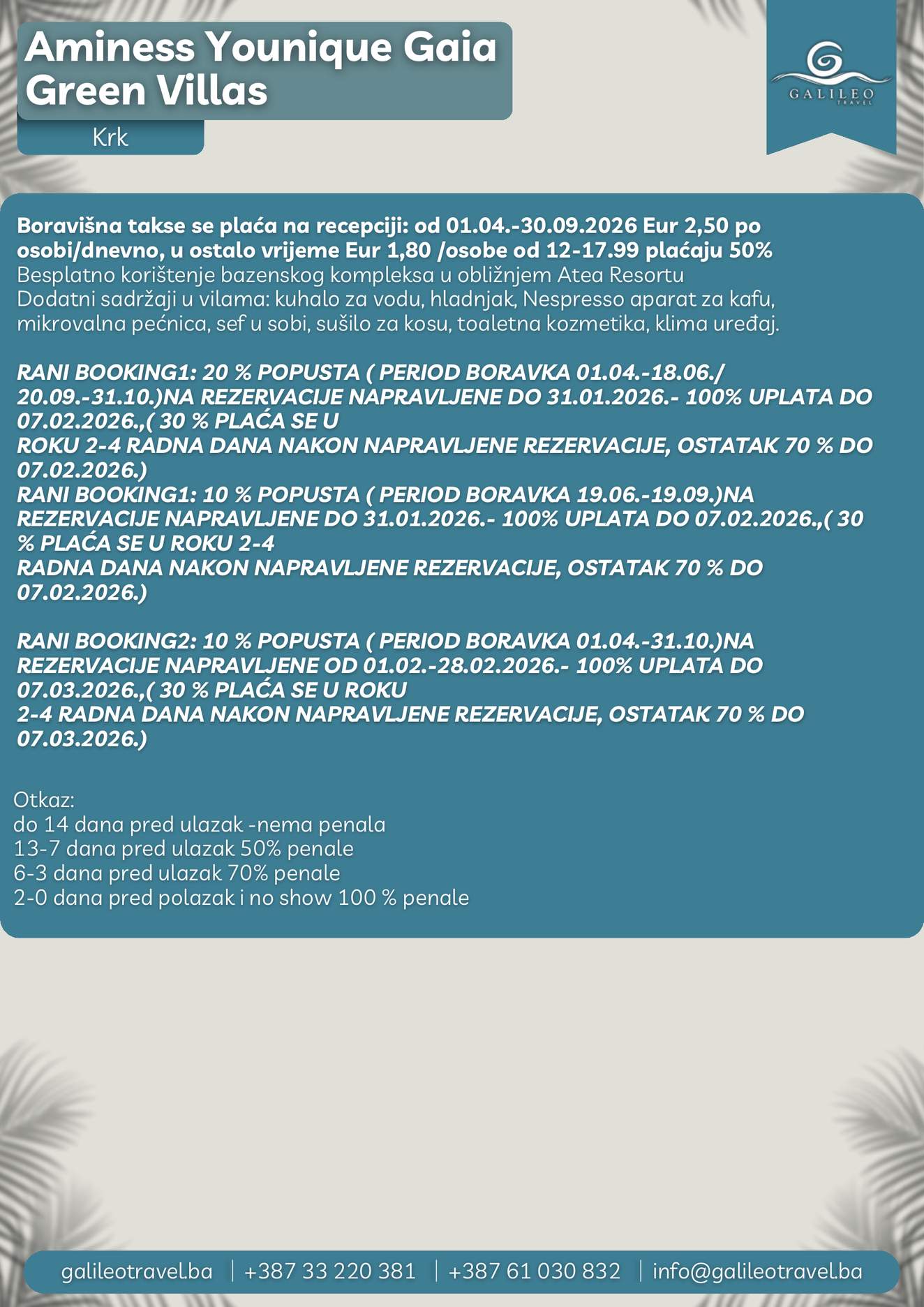 AMINESS YOUNIQUE GAIA GREEN VILLAS AMINESS YOUNIQUE GAIA GREEN VILLAS 208 Cijena od BAMKM208/osoba Broj putnika: 208 Ukupno KM 208 BAM Provjera dostupnosti O putovanju Destinacija: Hrvatska Tip putovanja