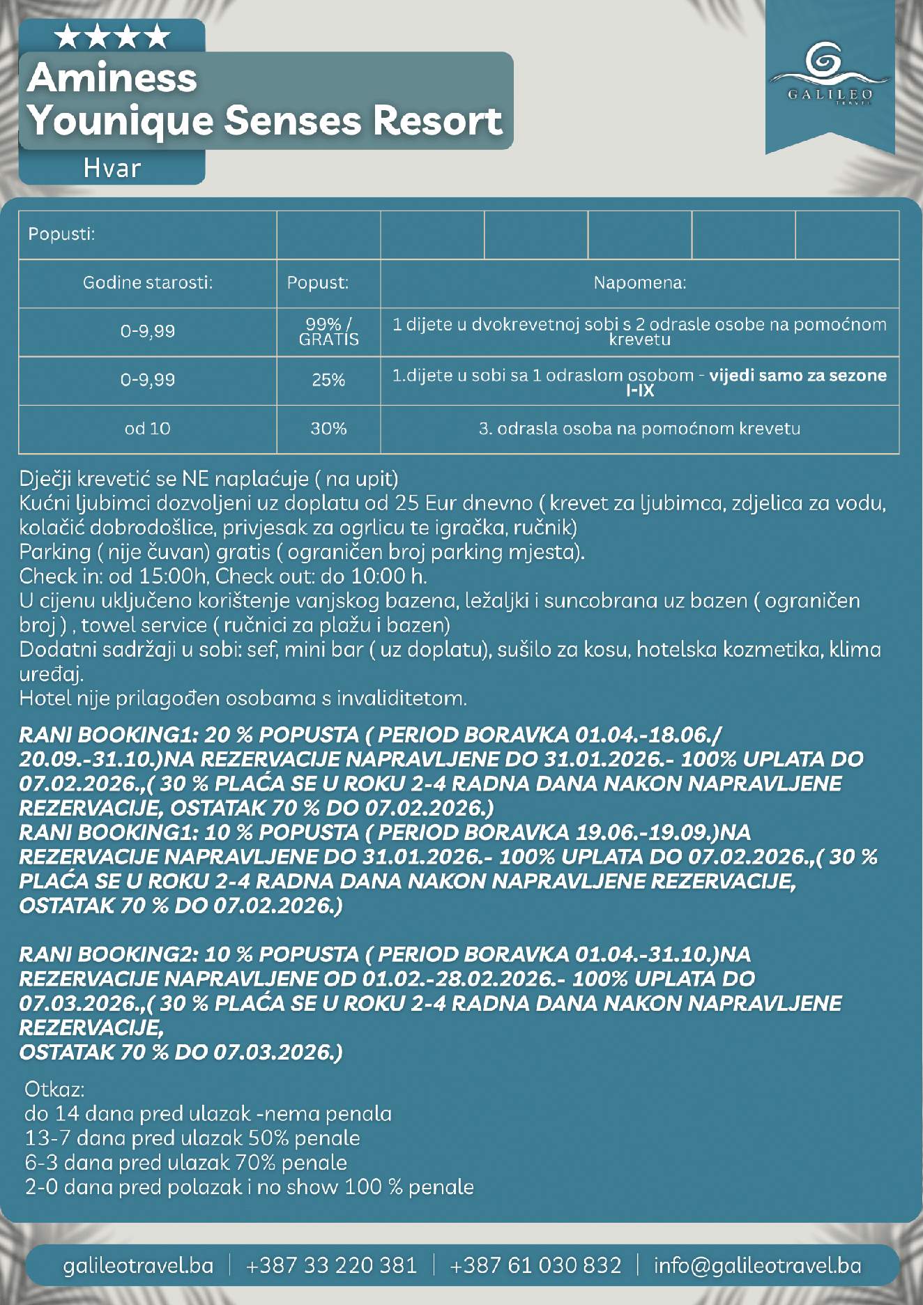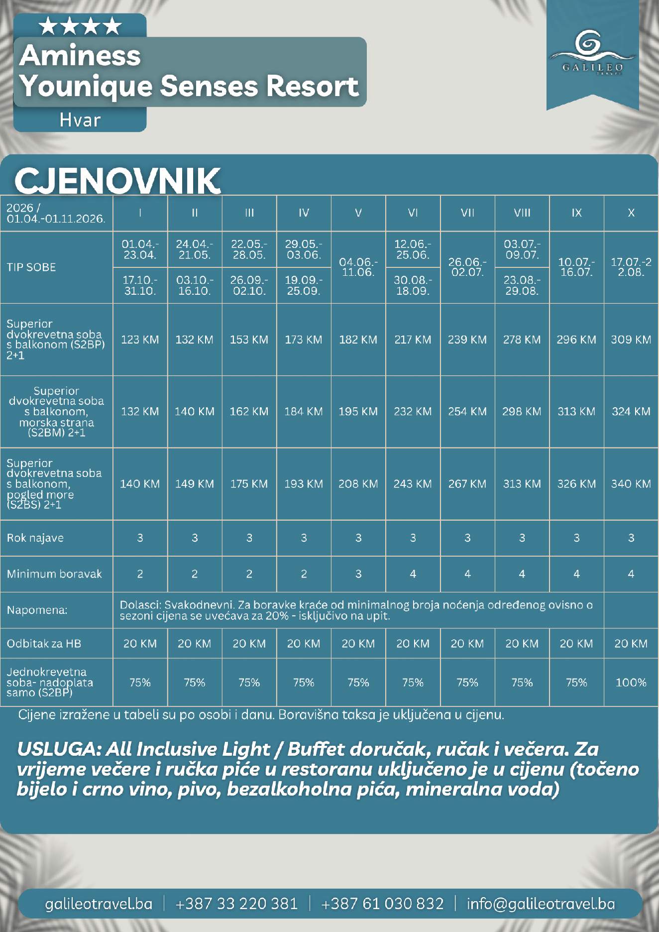 AMINESS YOUNIQUE SENSES RESORT HVAR AMINESS YOUNIQUE SENSES RESORT HVAR 123 Cijena od BAMKM123/osoba Broj putnika: 123 Ukupno KM 123 BAM Provjera dostupnosti O putovanju Destinacija: Hrvatska Smještaj: Dvokrevetne i trokrevetne sobe ALL INCLUSIVE: ALL INCLUSIVE LIGHT Tip putovanja