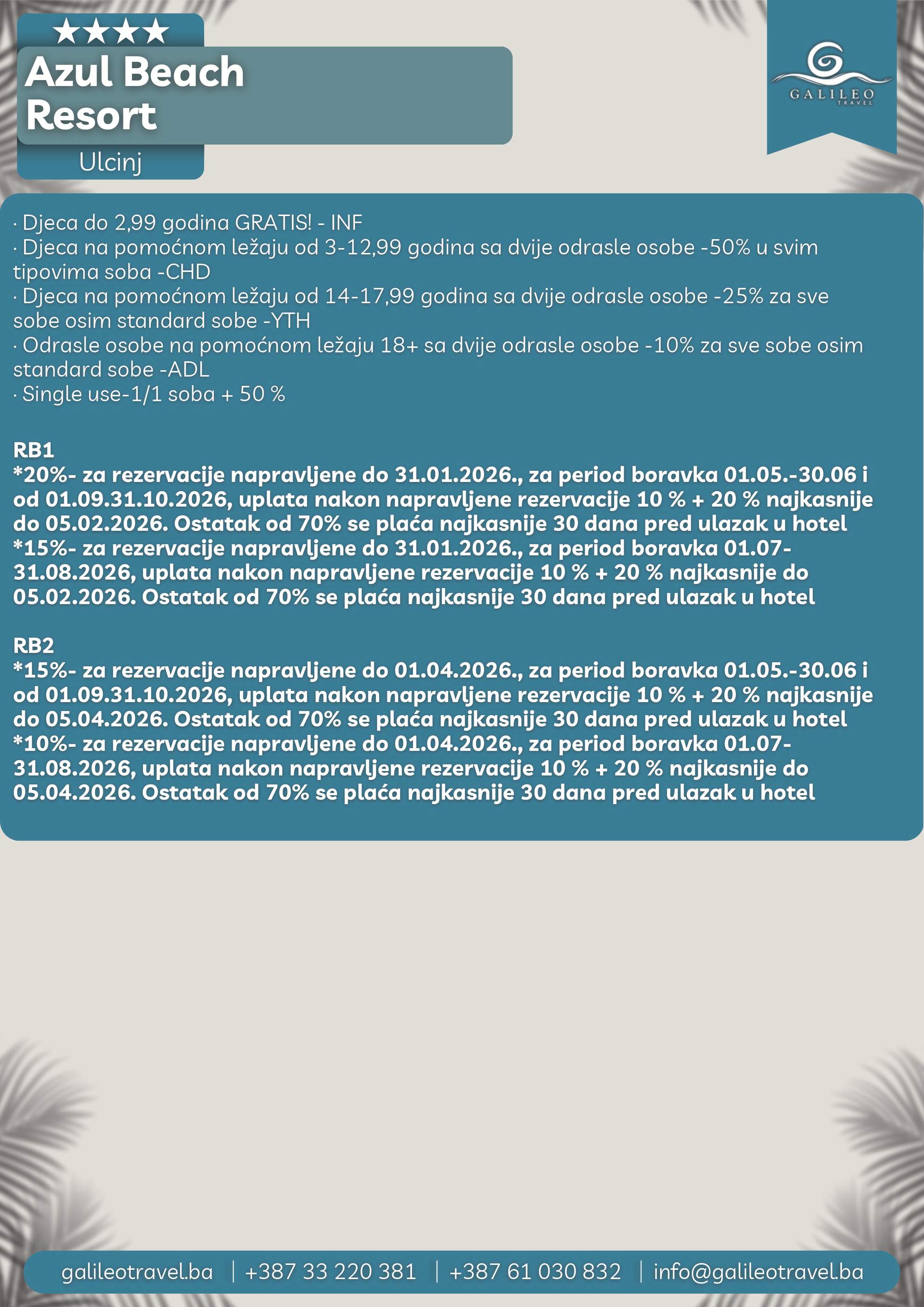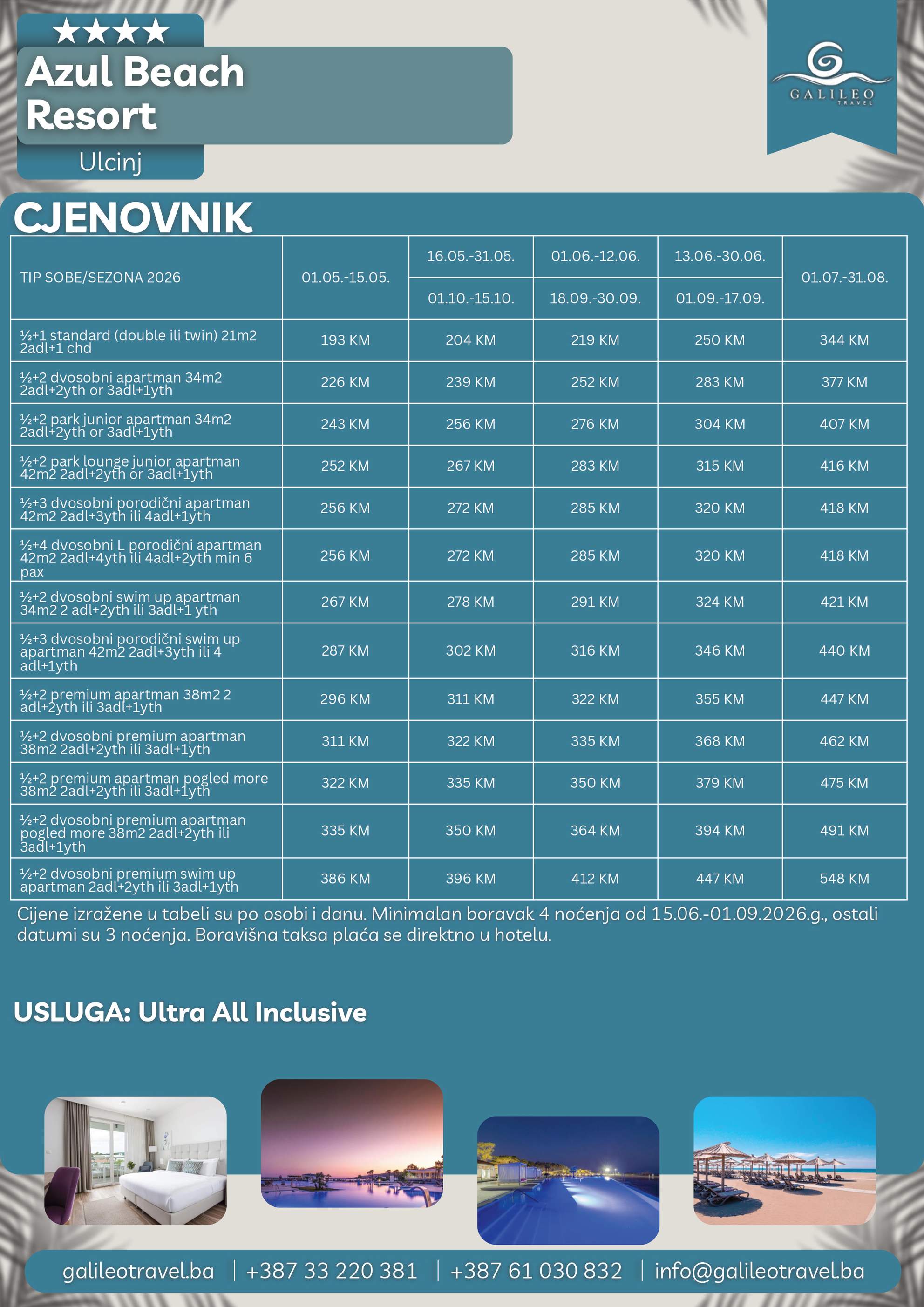Azul Beach Resort Azul Beach Resort 193 Cijena od BAMKM193/osoba Broj putnika: 193 Ukupno KM 193 BAM Provjera dostupnosti O putovanju Destinacija: Crna Gora Smještaj: Dvokrevetne i trokrevetne sobe ALL INCLUSIVE: Ultra All inclusive Tip putovanja