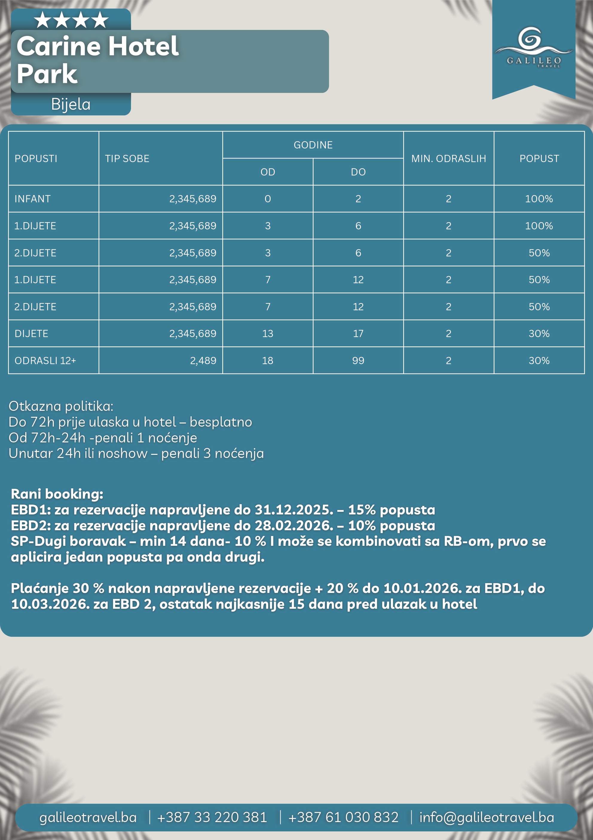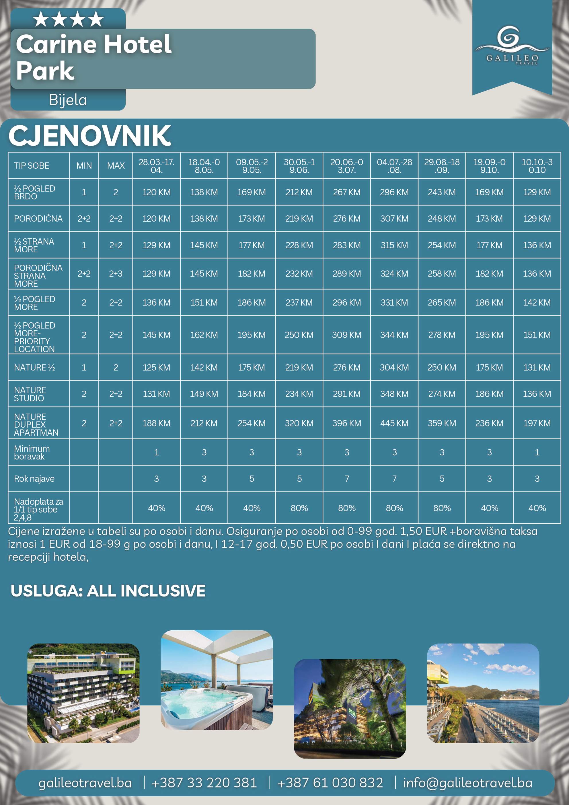 CARINE HOTEL PARK CARINE HOTEL PARK 120 Cijena od BAMKM120/osoba Broj putnika: 120 Ukupno KM 120 BAM Provjera dostupnosti O putovanju Destinacija: Crna Gora Smještaj: Dvokrevetne i trokrevetne sobe ALL INCLUSIVE: Uključen u cijenu Tip putovanja