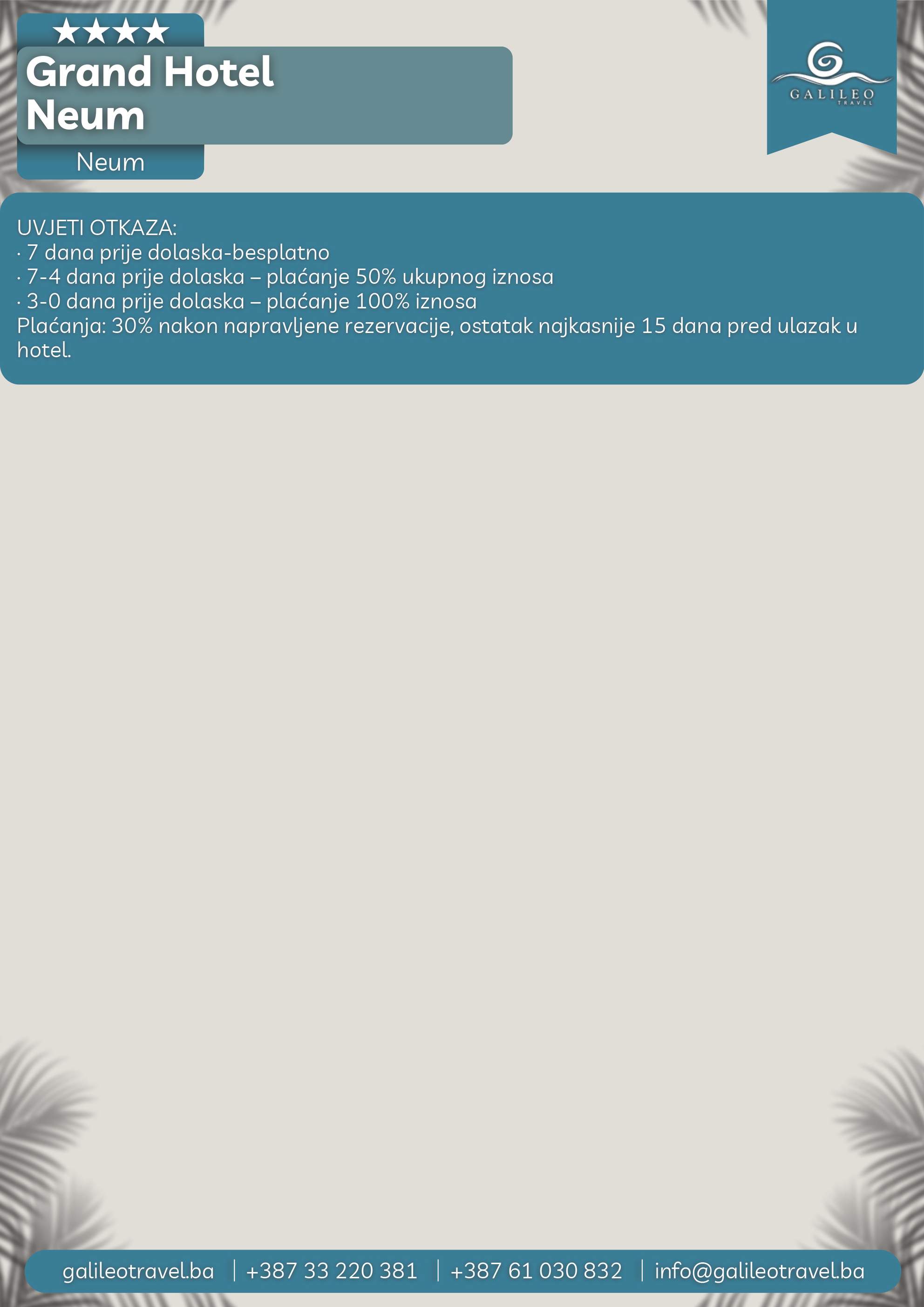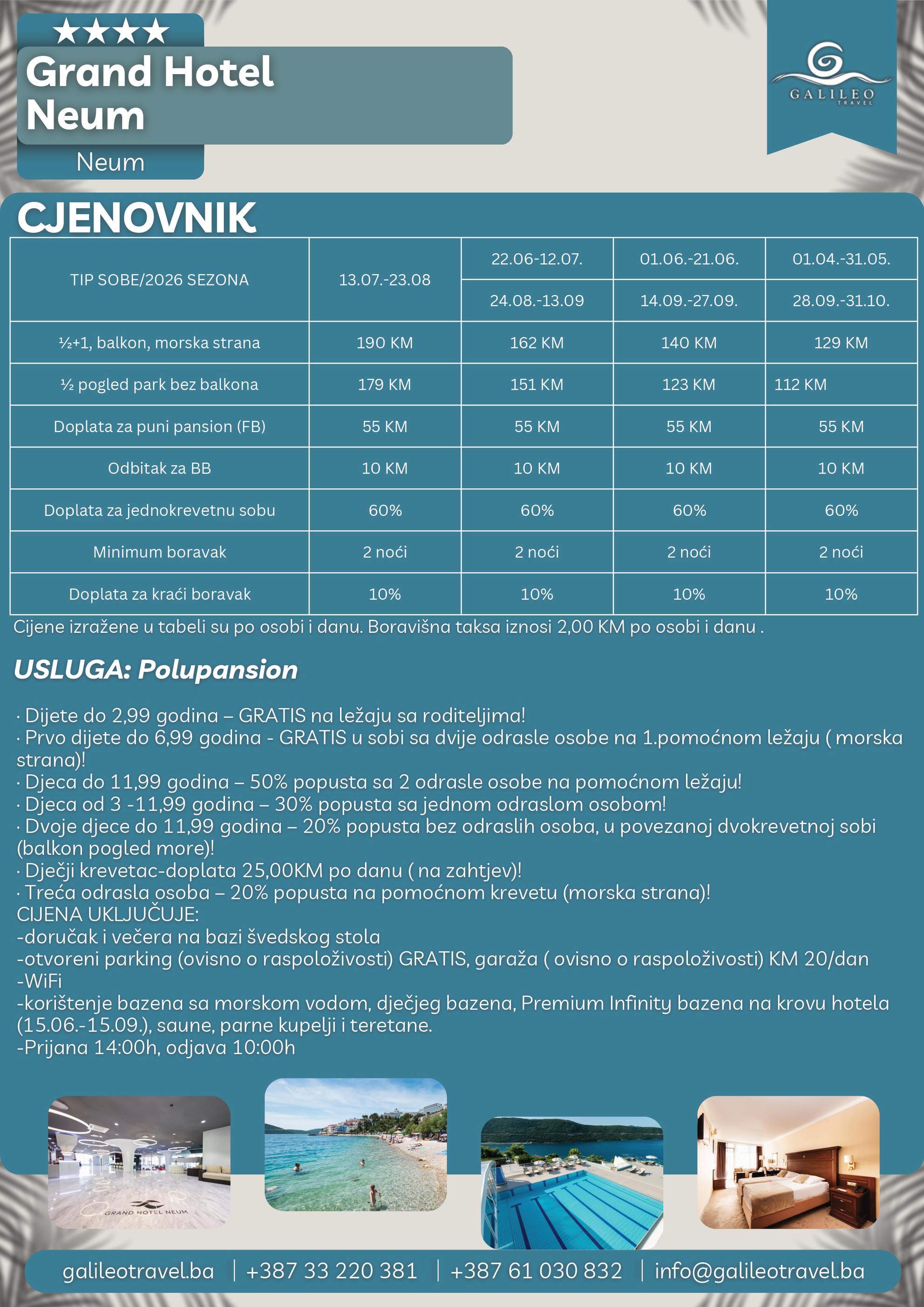 GRAND HOTEL NEUM GRAND HOTEL NEUM 129 Cijena od BAMKM129/osoba Broj putnika: 129 Ukupno KM 129 BAM Provjera dostupnosti O putovanju Destinacija: Bosna i Hercegovina Smještaj: Dvokrevetne i trokrevetne sobe Polupansion: Uključen u cijenu Tip putovanja