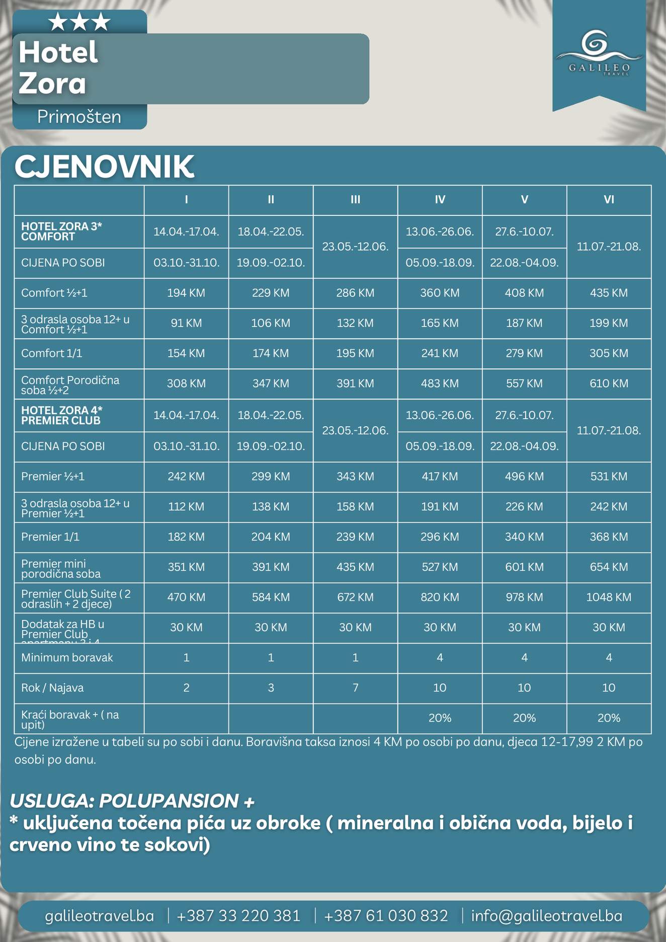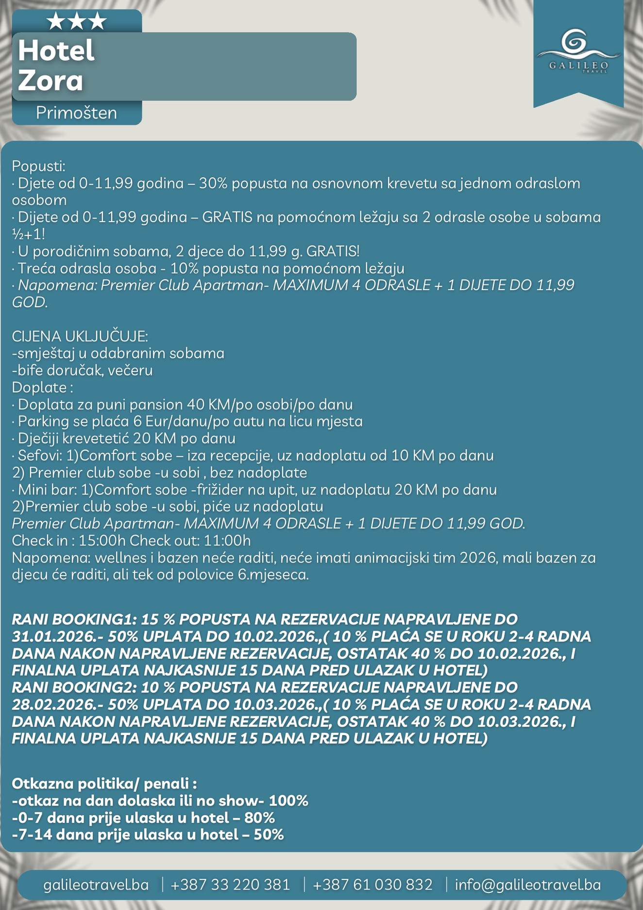 HOTEL ZORA HOTEL ZORA 194 Cijena od BAMKM194/osoba Broj putnika: 194 Ukupno KM 194 BAM Provjera dostupnosti O putovanju Destinacija: Hrvatska Smještaj: Dvokrevetne i trokrevetne sobe Polupansion: Uključen u cijenu Tip putovanja
