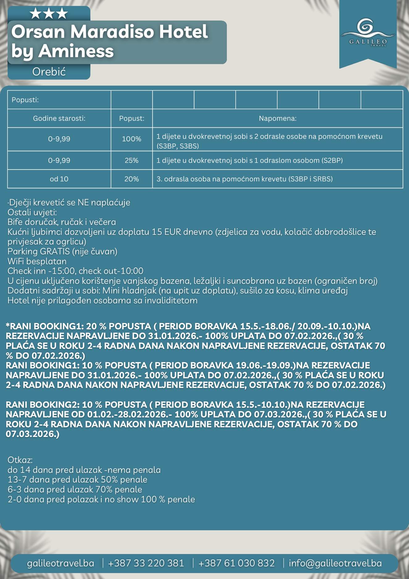 Orsan Maradiso Hotel by Aminess Orsan Maradiso Hotel by Aminess 105 Cijena od BAMKM105/osoba Broj putnika: 105 Ukupno KM 105 BAM Provjera dostupnosti O putovanju Destinacija: Hrvatska Smještaj: Dvokrevetne i trokrevetne sobe ALL INCLUSIVE: ALL INCLUSIVE LIGHT Tip putovanja