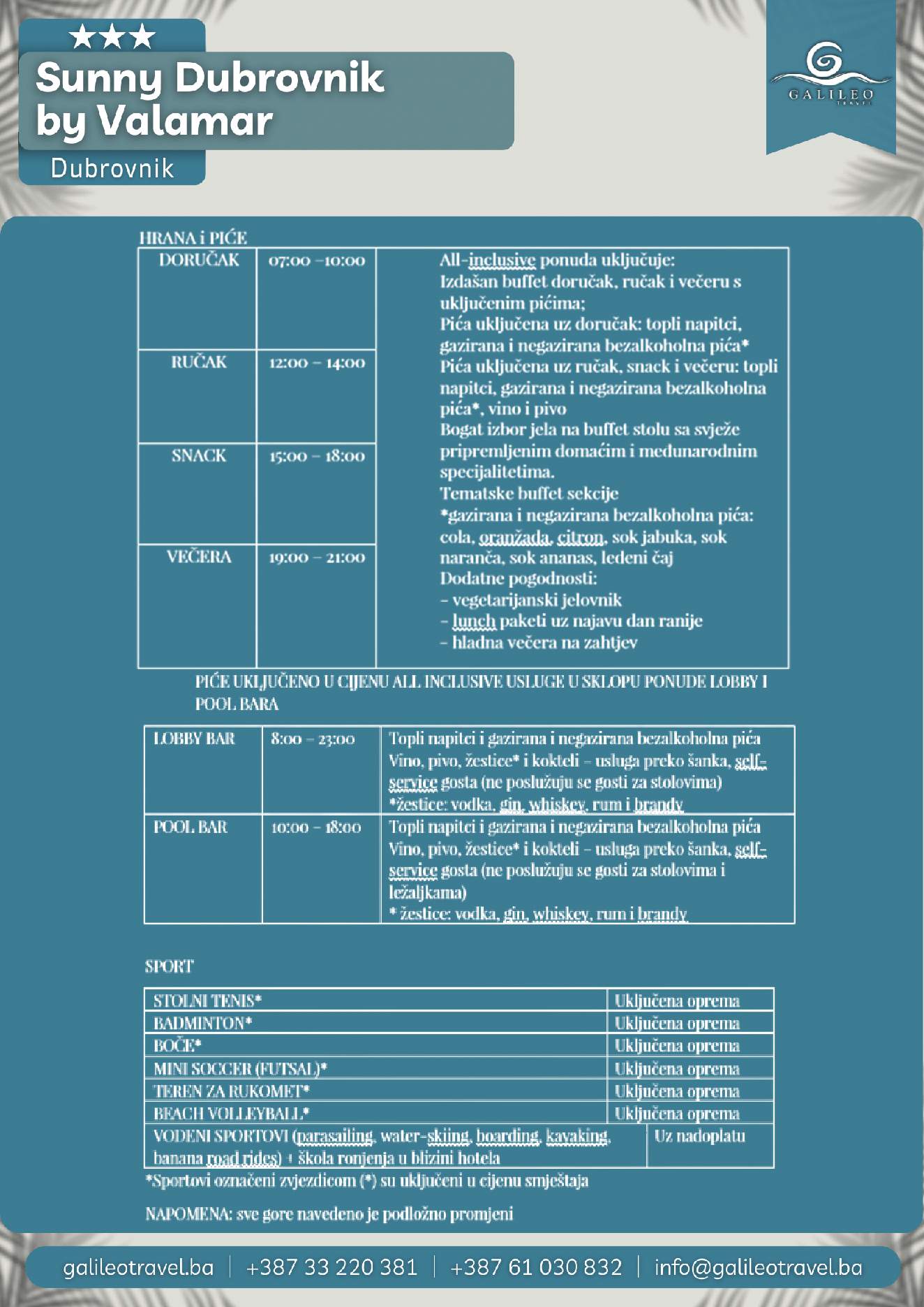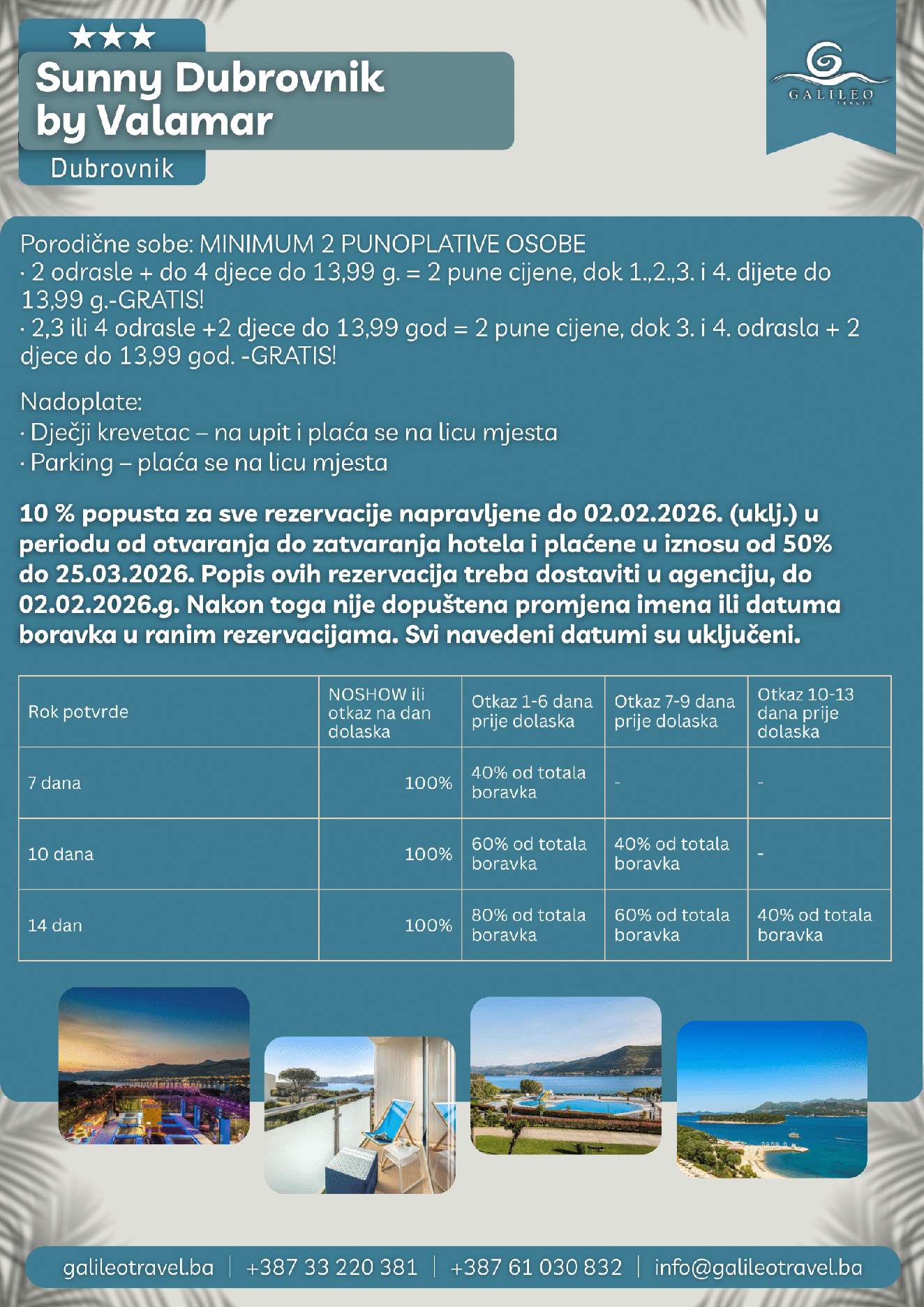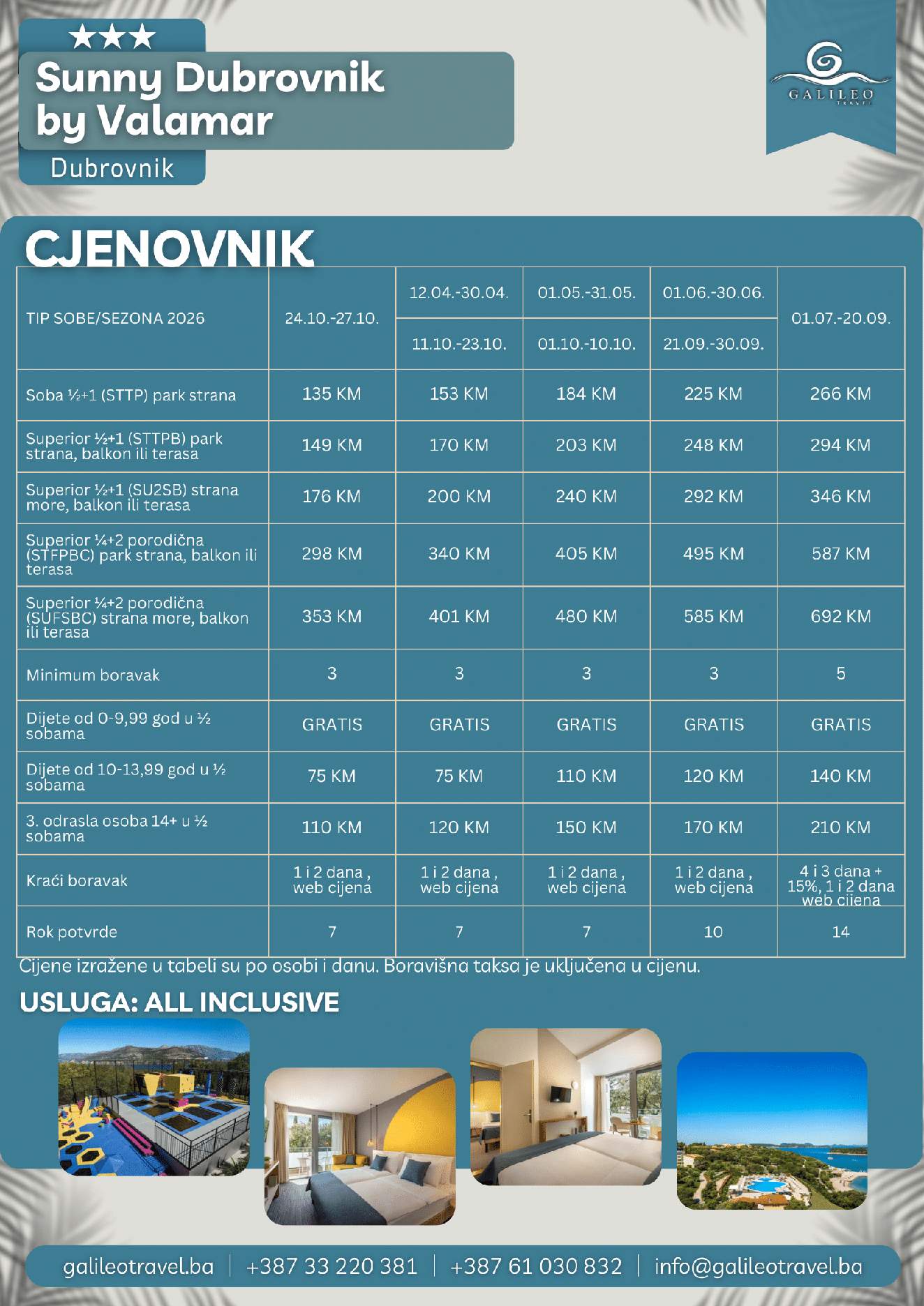 SUNNY DUBROVNIK BY VALAMAR 3 SUNNY DUBROVNIK BY VALAMAR 3 135 Cijena od BAMKM135/osoba Broj putnika: 135 Ukupno KM 135 BAM Provjera dostupnosti O putovanju Destinacija: Hrvatska Smještaj: Dvokrevetne i trokrevetne sobe ALL INCLUSIVE: Uključen u cijenu Tip putovanja