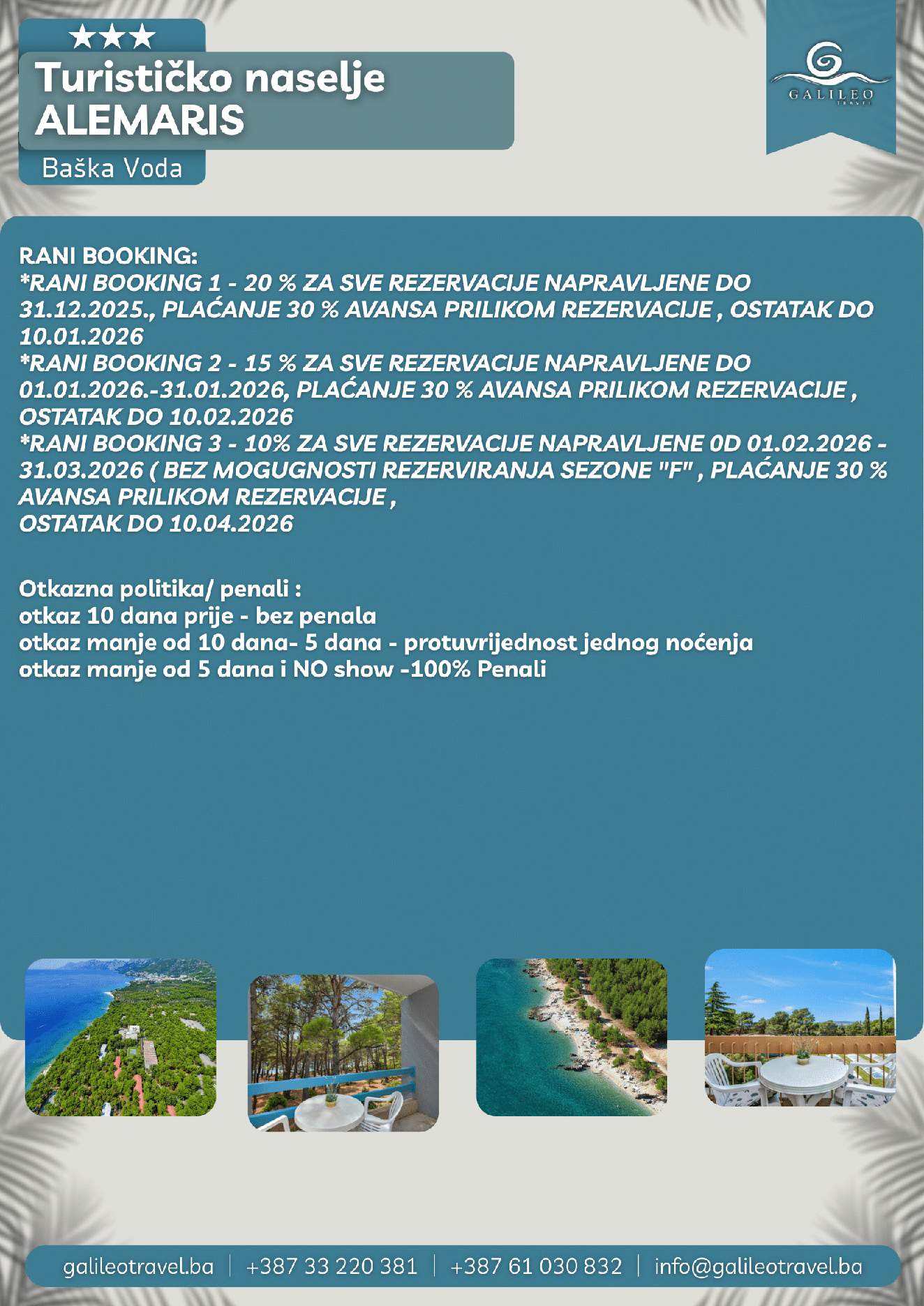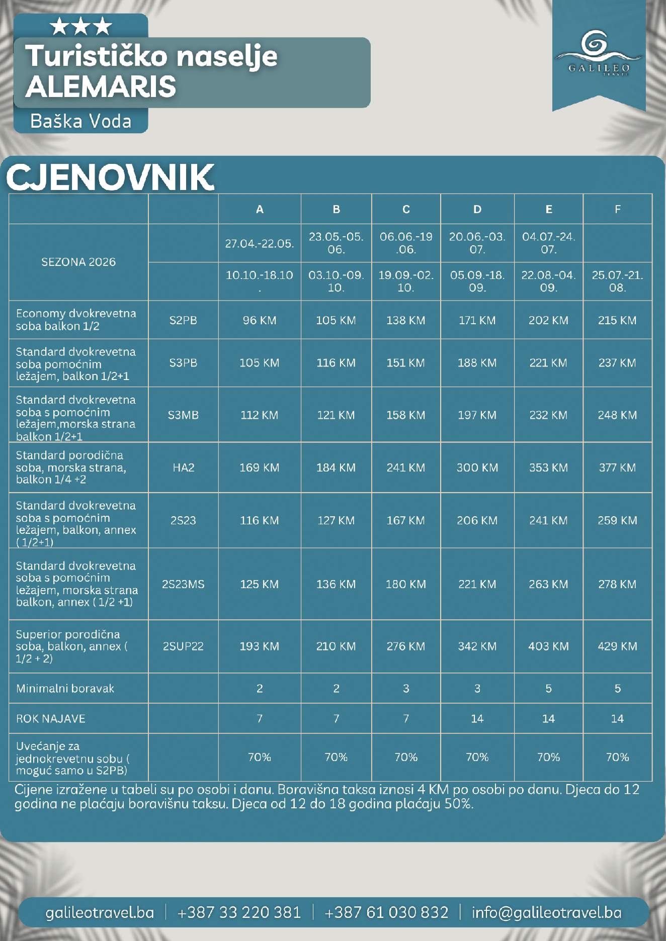 TURISTIČKO NASELJE ALEMARIS 3 TURISTIČKO NASELJE ALEMARIS 3 96 Cijena od BAMKM96/osoba Broj putnika: 96 Ukupno KM 96 BAM Provjera dostupnosti O putovanju Destinacija: Hrvatska Smještaj: Dvokrevetne i trokrevetne sobe Polupansion: Uključen u cijenu Tip putovanja
