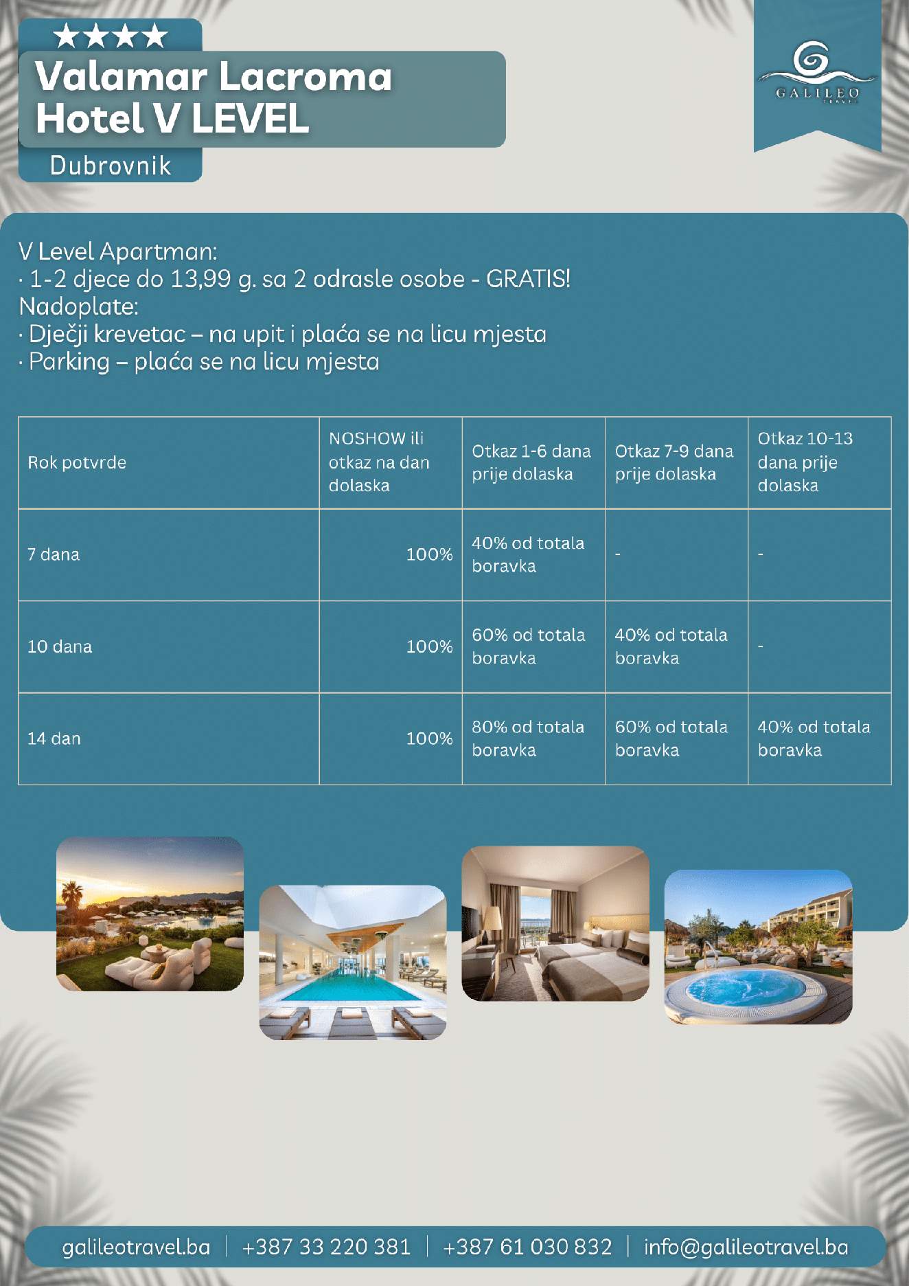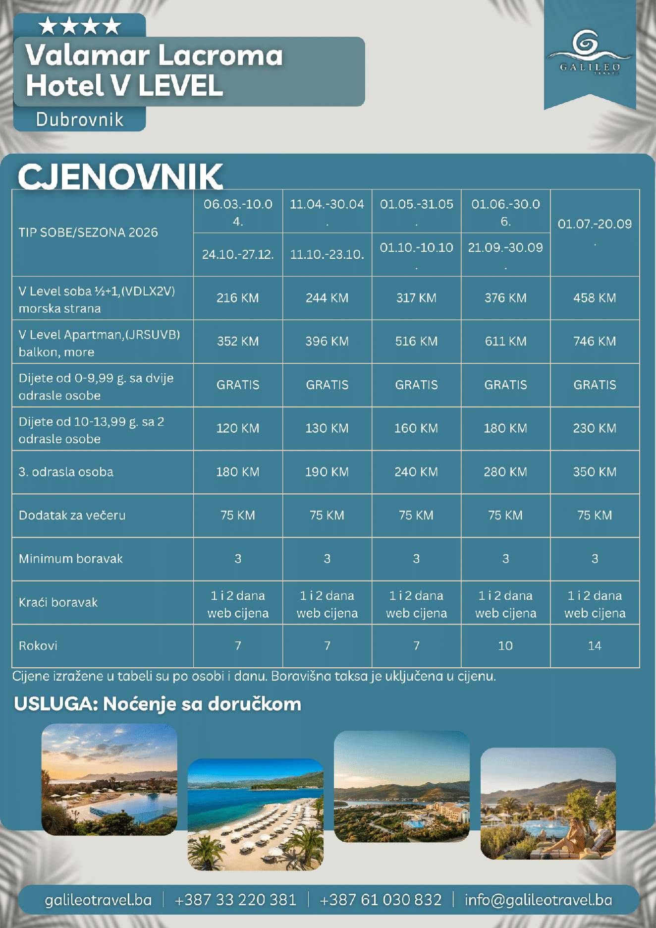 VALAMAR LACROMA HOTEL 4 V LEVEL - 1 Dan VALAMAR LACROMA HOTEL 4 V LEVEL 216 Cijena od BAMKM216/osoba Broj putnika: 216 Ukupno KM 216 BAM Provjera dostupnosti O putovanju Destinacija: Hrvatska Smještaj: Dvokrevetne i trokrevetne sobe Doručak: Uključen u cijenu Tip putovanja