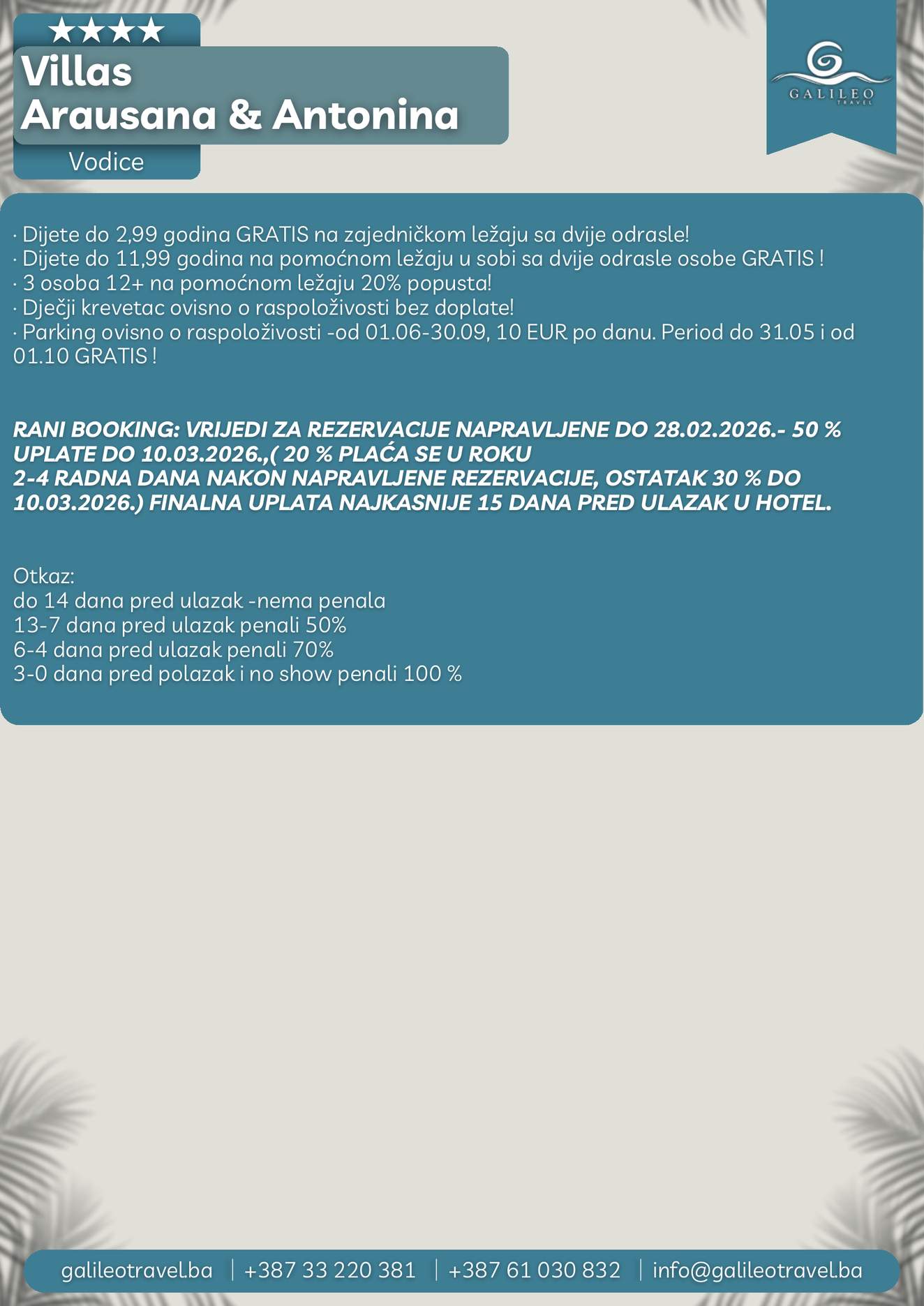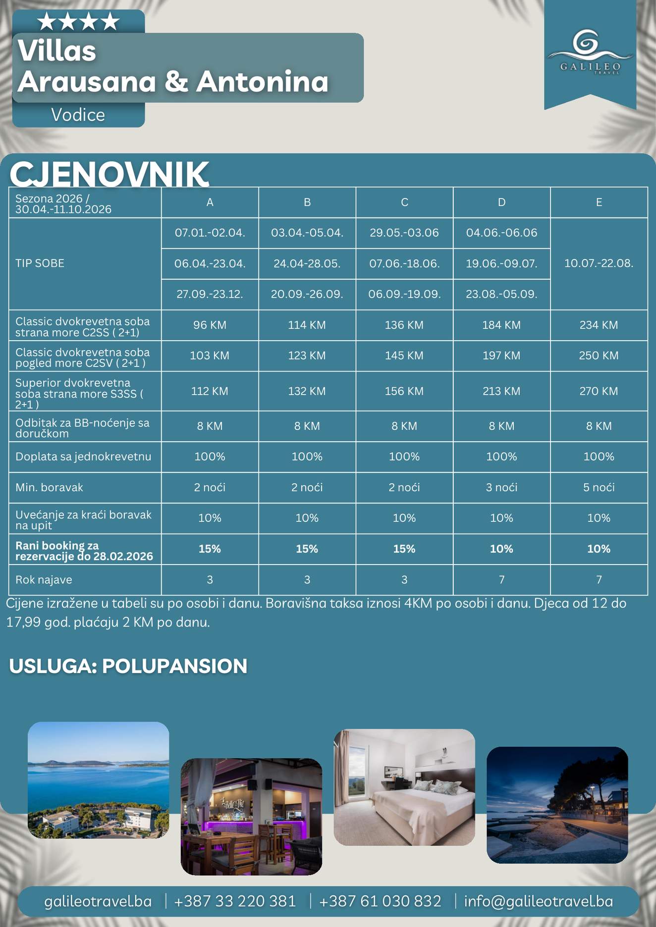 Villas Arausana & Antonina Villas Arausana & Antonina 96 Cijena od BAMKM96/osoba Broj putnika: 96 Ukupno KM 96 BAM Provjera dostupnosti O putovanju Destinacija: Hrvatska Smještaj: Dvokrevetne i trokrevetne sobe Polupansion: Uključen u cijenu Tip putovanja